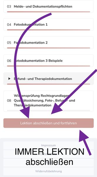 Beachten Sie ALLE LEKTIONEN IMMER über den Button "Lektion abschließen und fortfahren"zu beenden. Nur so bekommen Sie nach der Abschlussprüfung das Zertifikat. Sollten Sie dies nicht direkt machen, so MÜSSEN Sie dies später für alle Lektionen nachholen. Dies sind Vorgaben der Bundesärztekammer, dass alle Lektionen bearbeitet wurden.
