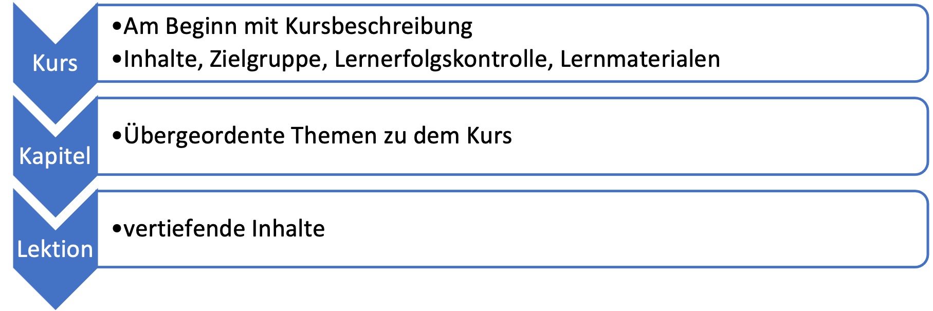 Eine Fortbildung besteht immer aus einem Kurs. Die Kurse bestehen aus mehreren Kapiteln und die Kapitel bestehen aus mehreren Lektionen.